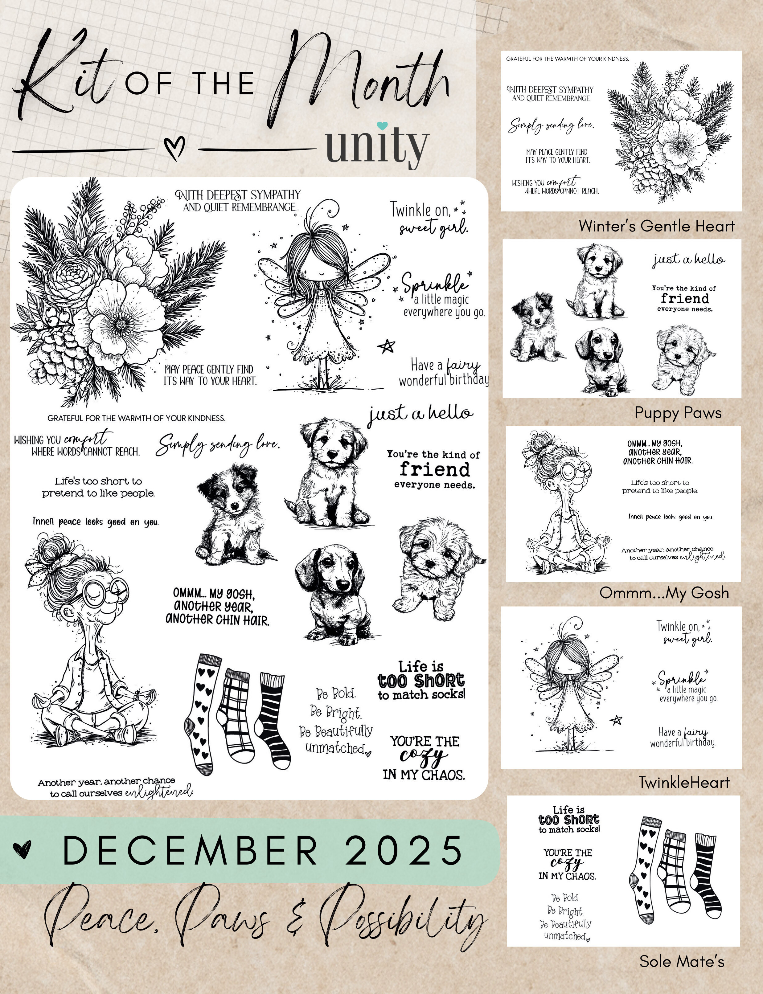 This is a PAST kit of the month. This is a full 8.5 x 11 sheet of un-mounted deeply etched red rubber stamps.